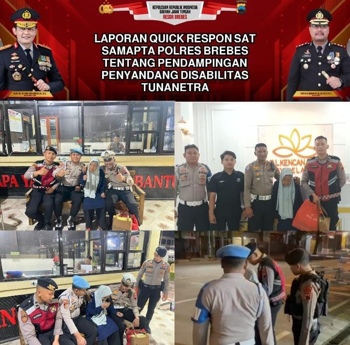 BREBES | bhayangkaraperdananews.com – Wajah humanis Kepolisian Resor Brebes kembali ditunjukkan oleh personel Satuan Samapta (Sat Samapta). Pada Kamis (9/10/2025) malam, anggota Sat Samapta sigap memberikan pendampingan dan bantuan kepada seorang penyandang disabilitas tunanetra yang kebingungan dan singgah di Markas Komando (Mako) Polres Brebes.