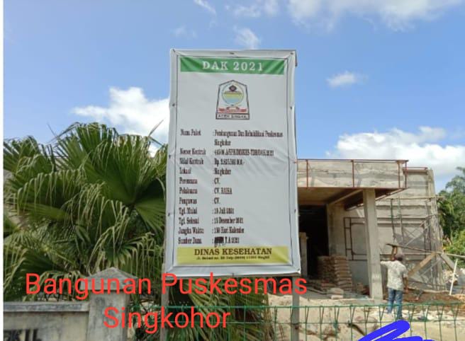 Diketahui sebelumnya, Pembangunan Puskesmas Singkohor dikerjakan oleh CV Raisa, dengan pagu anggaran senilai Rp2.835.500.000.- sesuai famplet yang dipasang awal pembangunan. (MBPN_A1/02.HT)