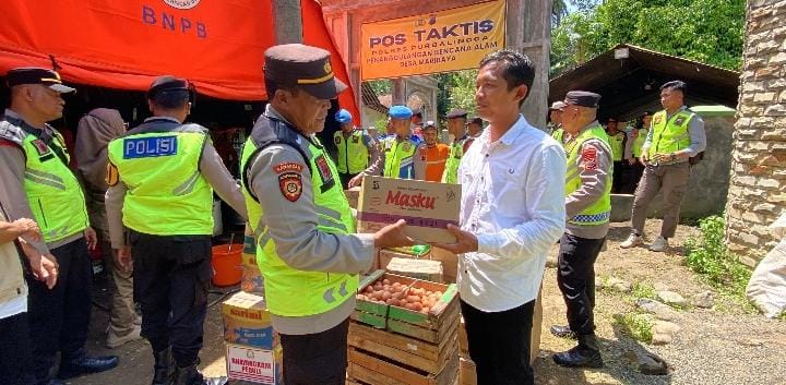“Hari ini kami kembali melaksanakan bakti sosial dengan memberikan bantuan sembako dan selimut kepada warga terdampak bencana tanah bergerak di Desa Maribaya,” ujar AKP Tri Haryanto.