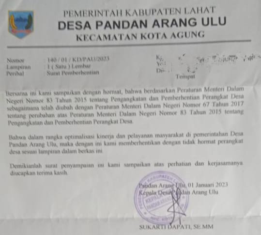 Sementara Surat Pemberhentian mereka dikeluarkan pada tanggal : 01 Januari 2023 yang ditanda tangani oleh kepala Desa Pandan Arang Ulu Nomor :140/01/KD/PAI/2023 sebelum nya mereka sudah beberapa kali mempertanyakan kepada kepala Desa dikarenakan Tunjungan Gaji dalam kurun setiap 1(Satu) Bulan mereka harus menerima namun yang terjadi di luar dugaan ,