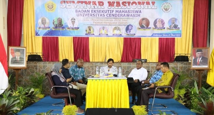 Jayapura – Wakil Menteri Dalam Negeri (Wamendagri) John Wempi Wetipo memaparkan materi dengan topik “Pesta Demokrasi 2024” di Auditorium Universitas Cenderawasih (Uncen) Papua, Jumat (24/3/2023). Paparan tersebut sekaligus merupakan tema seminar nasional yang diangkat oleh Badan Eksekutif Mahasiswa (BEM) Uncen.