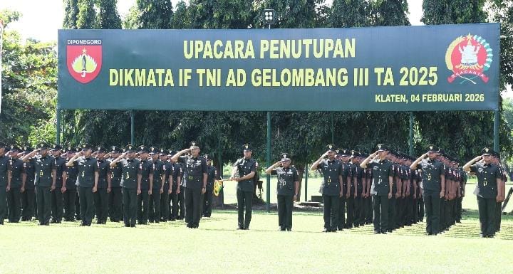 JATENG | bhayangkaraperdananews.com – Pendidikan Pertama Tamtama (Dikmata) Infanteri TNI Angkatan Darat Gelombang III Tahun Anggaran 2025 resmi ditutup secara serentak di Lapangan Dodiklatpur Klaten dan Secata Rindam IV/Diponegoro, Gombong, Kabupaten Kebumen. Upacara penutupan di Klaten dipimpin Kasdam IV/Diponegoro Brigjen TNI M. Andhy Kusuma, S.Sos., M.M., M.Han., CFrA., sementara di Gombong dipimpin Danrindam IV/Diponegoro Brigjen TNI Hindratno Devidanto, S.E., M.M., M.Han. Rabu (4/2/2026).