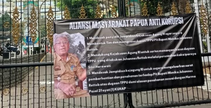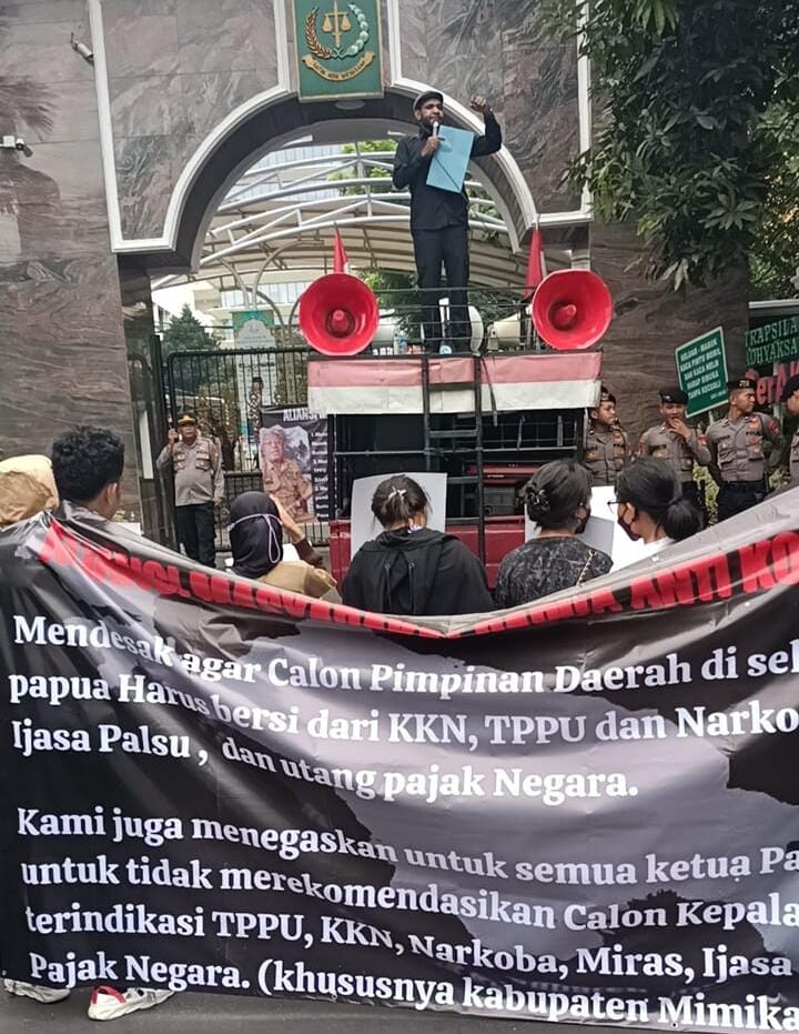 Aksi mereka menggeruduk gedung Kejagung untuk mempertanyakan sikap Lembaga penegak hukum itu dalam penegakan Hukum terhadap skandal dugaan Tindak Pidana Pencucian Uang Plt Bupati Mimika Johanes Rettob.
