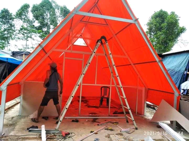 Huntara ini berukuran 4×6 meter, dengan rangka baja ringan, berdinding calsiboard, beratap terpal dengan lantai plester.