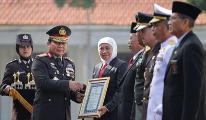 Sementara itu Dirreskrimum dan Dirreskrimsus Polda Jatim menerima penghargaan Jer Basuki Mawa Beya dari Gubernur Jawa Timur Khofifah Indar Parawansa.” (MBPN-IRWIN)