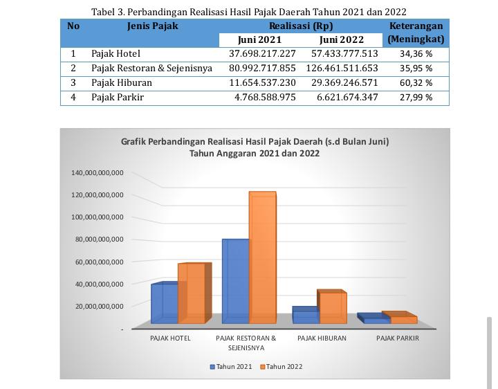Pada tabel 3 dan grafik perbandingan realisasi di bawah dapat dilihat bahwa pada bulan yang sama yaitu pada Bulan Juni dihasilkan antara lain, di Tahun 2022 ini ke-4 (empat) Jenis Pajak tersebut mengalami kenaikan yang cukup signifikan dibandingkan dengan Tahun 2021 yang lalu, hal tersebut dikarenakan pada Tahun 2021 yang lalu masa penyebaran pandemi Covid-19 masih cukup tinggi dibandingkan Tahun 2022 saat ini yang relatif melandai, dan juga pengaruh dari pemberlakuan kebijakan PPKM Level 2 saat ini di Wilayah Jabodetabek dan sebagian besar Wilayah Indonesia.