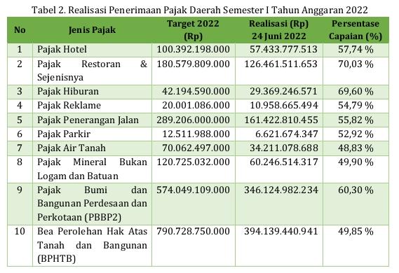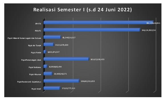 Dari hasil kebijakan relaksasi pajak daerah dapat dilihat bahwa realisasi penerimaan pajak daerah Semester I (s.d 24 Juni) Tahun Anggaran 2022 di beberapa jenis pajak daerah menghasilkan penerimaan realisasi pajak yang cukup signifikan. Berdasarkan data realisasi penerimaan pajak daerah sampai dengan Semester I (s.d 24 Juni) Tahun Anggaran 2022 mencapai Rp. 1.226.989.702.213,- atau 55,76% dari target  sebesar Rp. 2.200.451.059.000,-