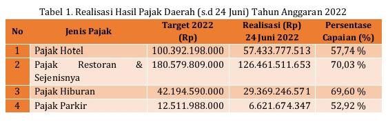 Capaian penerimaan pajak daerah dari 4 jenis pajak daerah tersebut antara lain dapat dilihat pada Tabel 1 sebagai berikut: