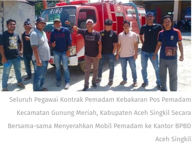 Aceh Singkil, bhayangkaraperdananews.com – Apabila terjadi sesuatu hal kebakaran, kecamatan gunung meriah hati-hati, dan sudah sangat naif. Gawat ! Mungkin itulah yang ada dibenak masyarakat se kecamatan, pemduduk yang paling terpadat di kabupaten Aceh Singkil itu. Apa sebab, karena petugas pemadam telah mengantarkan mobil pemadam ke dinas terkait yaitu BPBD di Singkil.