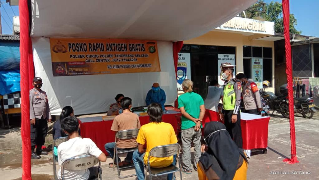 Berdasarkan pantauan di lokasi nampak warga terlihat antusias saat mengikuti swab di Posko Swab bertempat di halaman Mako Polsek Curug Polres Tangerang Selatan, Jl. Raya STPI Km. 05 Kel. Curug Kulon Kec. Curug Kab. Tangerang, (30/5/21).