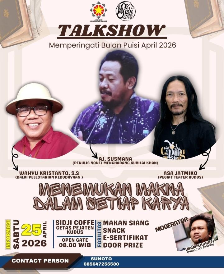 KUDUS | bhayangkaraperdananews.com – Dalam rangka memperingati Bulan Puisi 2026, Jaringan Kebudayaan Rakyat (JAKER) Kabupaten Kudus akan menggelar diskusi/talkshow bertajuk “Sastra Untuk Negeri” dengan sub tema “Menemukan Makna Dalam Setiap Karya” pada Sabtu, 25 April 2026 di Sidji Coffee, Getas Pejaten, Kecamatan Jati, Kudus.