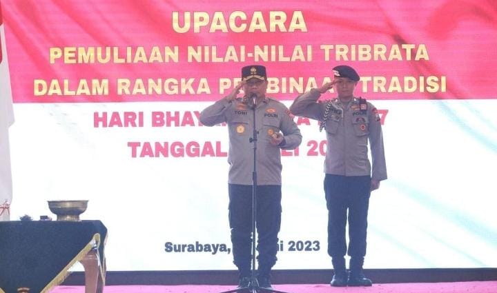 SURABAYA | bhayangkaraperdananews.com – Kapolda Jawa Timur Irjen Pol Dr Toni Harmanto,M.H memimpin upacara pemuliaan nilai nilai luhur Tribrata, Pataka Polda Jatim “Tan Hana Dharma Mangrwa di Lantai 2 Gedung Patuh Mapolda Jatim,Rabu (21/6/2023).