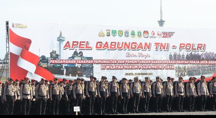 JAKARTA | bhayangkaraperdananews.com – Ribuan personel gabungan dari TNI, Polri, dan Pemprov DKI Jakarta bersatu dalam apel kesiapan Operasi Mantap Praja Jaya 2024 di Lapangan Silang Monas, Jakarta Pusat, Senin (25/11/2024). Kegiatan ini bertujuan memastikan kelancaran pengamanan Pilkada Serentak 2024 yang akan berlangsung Rabu, 27 November 2024.