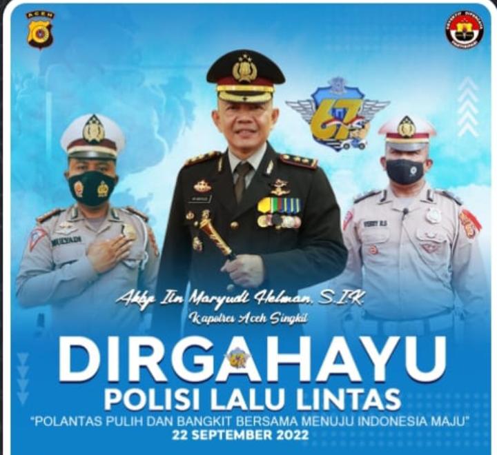 Aceh Singkil, bhayangkaraperdananews.com – Kapolres Aceh Singkil, AKBP Iin Maryudi Helman,SIK, mengucapkan dan memberi semangat, Dirgahayu hari jadi Polisi Lalu Lintas(Polantas) yang ke-67.