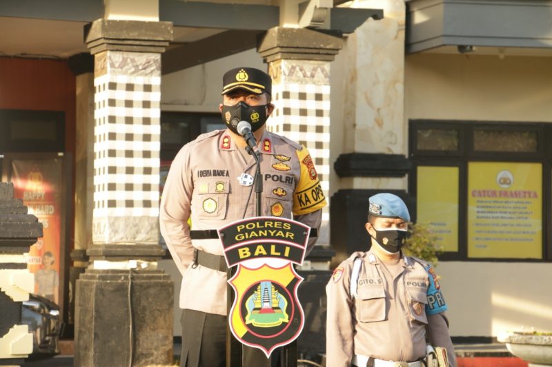 GIANYAR, bhayangkaraperdananews.com – Kapolres Gianyar AKBP I Dewa Made Adnyana, SIK., SH., MH. memimpin apel kesiapan personel Polres Gianyar yang terlibat di dalam Ops Ketupat Agung Tahun 2021 bertempat di Lapangan Apel Endra Dharmalaksana Polres Gianyar. Kamis (6/5/2021).