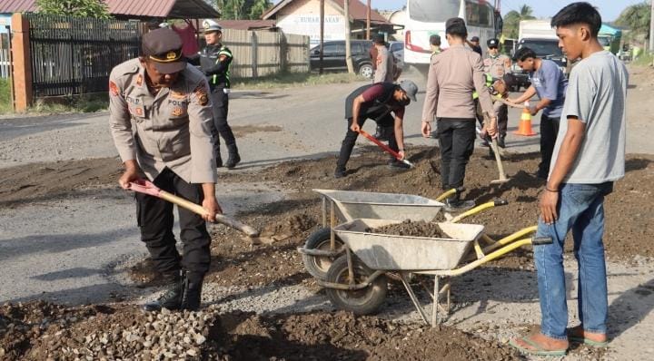 Kegiatan Polres Lahat yang di pusatkan di kecamatan Merapi Barat di 3( tiga) titik ruang jalan Nasional yang mengalami kerusakan berupa jalan berlubang, dengan cara melaksanakan penimbnan lubang menggunakan Agregat( campuran batu dan pasir).