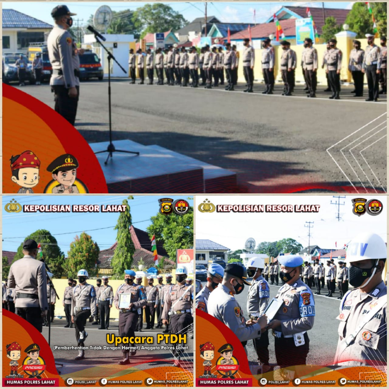 LAHAT, Bhayangkaraperdananews.com . Kapolda Sumsel melalui Kapolres Lahat AKBP Achmad Gusti Hartono, S.I.K, menggelar upacara Pemberhentian Tidak Dengan Hormat (PTDH) kepada salah seorang personil Polres Lahat, Bripka Barlian Yusuf, Rabu (02/06/21).
