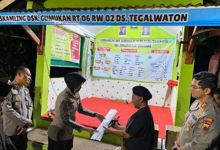 Selanjutnya AKBP Ratna memberikan bantuan peralatan Satkamling, sebagai sarana pendukung bagi warga yang melaksanakan jaga mengamankan lingkungan Ds. Tegalwaton Kec. Tengaran. (MBPN-Bei Okta/Polres Semarang)