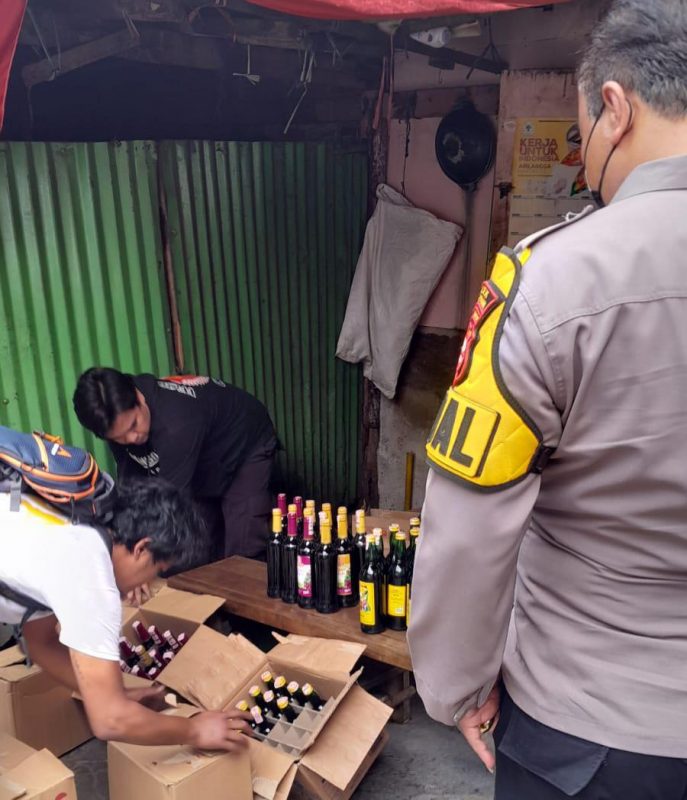 Dari salah satu warung tersebut, polisi menyita miras jenis angur dikemas dalam 6 dus ,kurang lebih 60 botol.