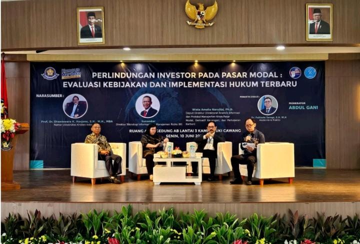 Sebagai upaya bagi masyarakat dalam mendapatkan pemahaman dan gambaran terkait dengan perlindungan investor pada pasar modal, mahasiswa Fakultas Hukum Universitas Kristen Indonesia (UKI), secara khusus Kelas “K” di bawah bimbingan dosen Pengampu, Dr. Paltiada Saragi, SH., M.H menyelenggarakan seminar dengan menghadirkan tiga orang Narasumber., yaitu Prof. Dr. Dhaniswara (Rektor Universitas Kristen Indonesia), Ibu Wista Amalia Narulita, Ph.D (Deputi Direktur OJK pada Direktorat Analisis Informasi dan Protokol Manajemen Krisis Pasar Modal, Derivative Keuangan dan Pertukaran Karbon) dan Bapak Sunandar (Direktur Teknologi Informasi dan Manajemen Resiko Bursa Efek Jakarta.