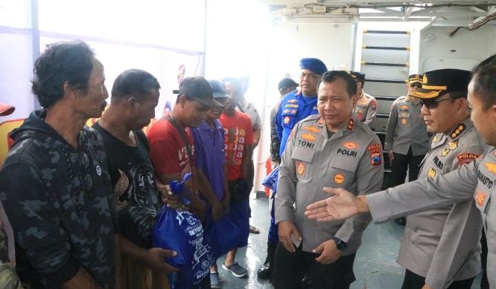 Setelah kegiatan dialog dan pemberikan santunan, Kapolda Jatim bersama rombongan berlayar ke Teluk Lamong dengan kapal Patroli Ditpolairud Polda Jatim.