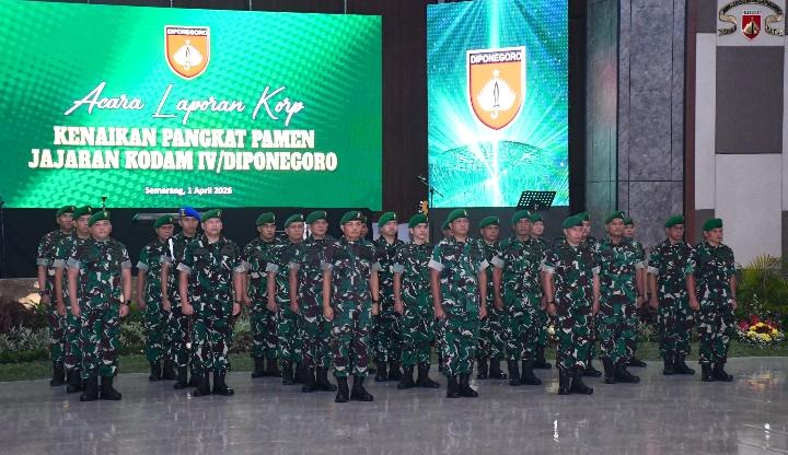 KOTA SEMARANG | bhayangkaraperdananews.com – Pangdam IV/Diponegoro Mayjen TNI Achiruddin, S.E., M.Han. memimpin langsung acara Laporan Korps Kenaikan Pangkat Perwira Menengah (Pamen) Kodam IV/Diponegoro yang digelar di Balai Diponegoro, Rabu (1/4/2026).