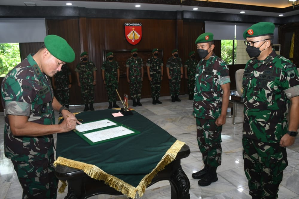 SEMARANG, bhayangkaraperdananews.com – Pangdam IV/Diponegoro Mayjen TNI Widi Prasetijono memimpin acara serah terima jabatan Kepala Keuangan Kodam IV/Diponegoro (Kakudam IV/Dip) dari Kolonel Cku Agus Daryanto, S.E. kepada Kolonel Cku Sonni Denni Sumolang di ruang kerja Pangdam IV/Diponegoro, Makodam IV/Dip, Jl. Perintis Kemerdekaan, Watugong, Selasa (30/8/2022).
