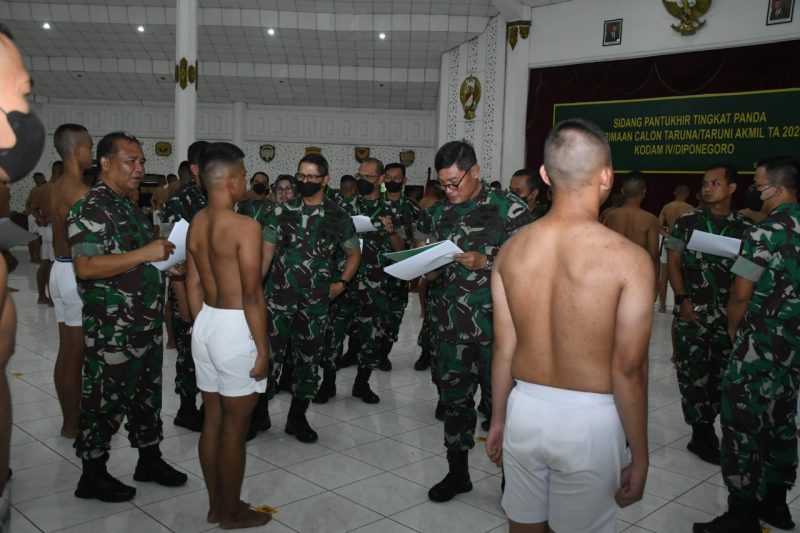 SEMARANG,Bhayangkaraperdananews.com – Pangdam IV/Diponegoro Mayjen TNI Widi Prasetijono memimpin pelaksanaan sidang Pantukhir TK. Panda Penerimaan Calon Taruna/Taruni Akademi Militer (Akmil) TA. 2022 wilayah Kodam IV/Diponegoro di Balai Diponegoro, Jl. Perintis Kemerdekaan, Sabtu (25/06/2022).