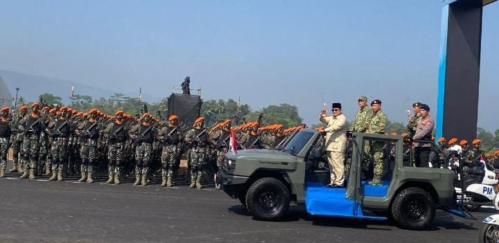 JABAR | bhayangkaraperdananews.com – Kunjungan kerja Presiden Republik Indonesia, Jenderal TNI (Purn) H. Prabowo Subianto Djojohadikusumo, ke Kabupaten Bandung Barat, Jawa Barat, berlangsung aman, tertib, dan kondusif. Kegiatan ini dipusatkan di Lanud Suparlan, Pusdiklatpassus Batujajar, dalam rangka menghadiri Upacara Gelar Pasukan Operasional dan Kehormatan Militer, yang diikuti lebih dari 13.400 pasukan dari tiga angkatan.