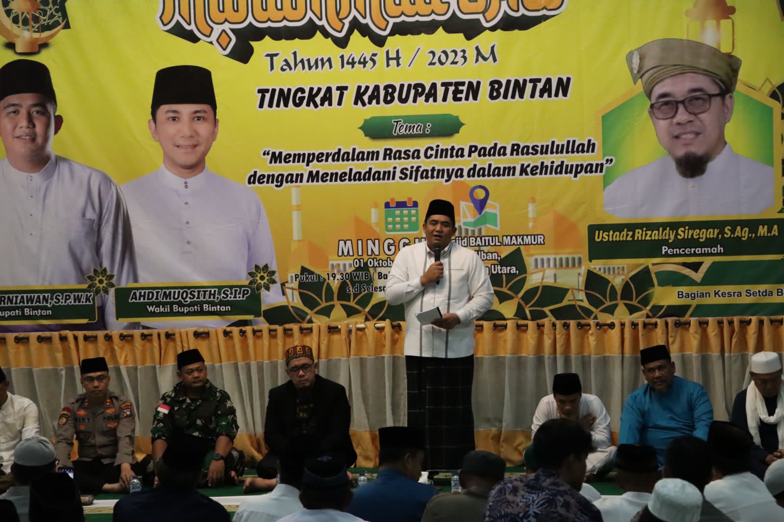 BINTAN | bhayangkaraperdananews.com – Peringatan Maulid Nabi Muhammad SAW 1445 Hijriyah/2023 Masehi menjadi momen bersejarah di Kabupaten Bintan, dengan tema “Menperdalam Rasa Cinta Pada Rasullah Dengan Meneladani Sifatnya Dalam Kehidupan.” Peringatan Maulid Nabi Muhammad SAW 1445 Hijriyah tersebut dilaksanakan di Masjid Baitul Makmur Kecamatan Bintan Utara yang dihadiri oleh Kepala Kepolisian Resor(Kapolres) Bintan AKBP Riky Iswoyo, S.I.K., M.M. Bupati Bintan Robby Kurniawan, S.Pw. K beserta Forum Komunikasi Pimpinan Daerah(Forkopimda) Kabupaten Bintan, Minggu (01/10/2023).