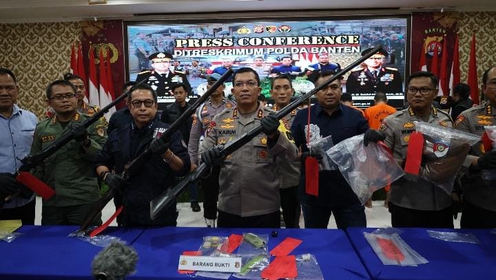 BANTEN | bhayangkaraperdananews.com – Polda Banten gelar press conference ungkap kasus kelanjutan pemburuan liar badak bercula satu di taman nasional ujung kulon pada Selasa (11/06).