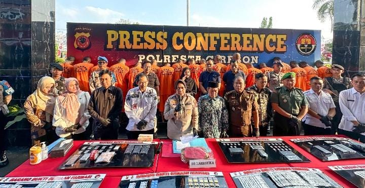 Kegiatan konferensi pers ini juga dihadiri oleh sejumlah pejabat dan tokoh daerah, antara lain Kasat Pol PP Kabupaten Cirebon, Kadishub, Kajari yang diwakili Kasi Pemulihan Aset dan Barbuk, Kasdim 0620, Ketua MUI, Kepala Dinas Kesehatan, Wakil Ketua DPRD, serta perwakilan Pengadilan Negeri Kabupaten Cirebon. Kehadiran lintas sektor ini menunjukkan sinergi yang kuat dalam mendukung upaya Polresta Cirebon memberantas narkoba hingga ke akar-akarnya. (MBPN-M.yus/Bid Humas Polda Jabar)