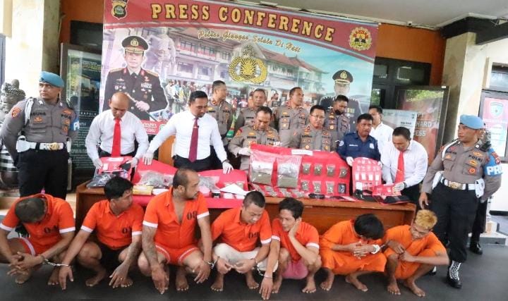 BALI, bhayangkaraperdananews.com – Gianyar, Petugas kepolisian dari Satuan Reserse Narkoba Polres Gianyar berhasil melakukan penangkapan terhadap 7 orang pelaku penyalahgunaan narkoba. Dari ke-7 orang pelaku, polisi berhasil mengamankan barang bukti sebesar 4,6 Kilogram narkoba jenis ganja.