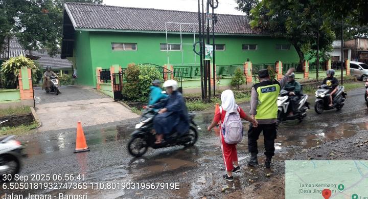JEPARA | bhayangkaraperdananews.com – Meski diguyur hujan ringan, personel Kepolisian Resor (Polres) Jepara, Polda Jawa Tengah, dan jajarannya tetap semangat melaksanakan pengaturan arus lalu lintas pagi hari di sejumlah titik rawan kemacetan, pada Selasa (30/9/2025) pagi.