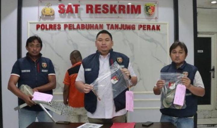 Satu pelaku MS diamankan anggota Jatanras Satreskrim Polres Tanjung Perak di Jalan Jakarta Surabaya pada Selasa (03/07/2023) usai melakukan aksinya mencuri kabel ground yang terbuat dari tembaga di gardu PLN Induk Perak Jalan Nilam Barat 2 – 4 Kota Surabaya, pada 15 Juni 2023 lalu.