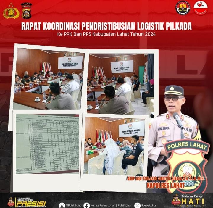 Pada hari jum’at tanggal 22 nopember 2024, Polres Lahat bersama dengan KPUD Lahat, Bawaslu Lahat, Kodim, Pemda, Kejaksaan Negeri, pihak PT. Pos Indonesia telah melaksanakan rapat Koordinasi tentang Pendistribusian Logistik Ke PPK, PPS dan TPS, menyepakati bahwa :