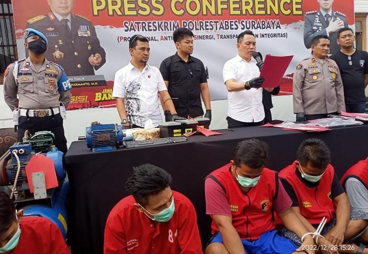 “Sementara tiga pelaku lainnya. RM, HF dan AD. merupakan sebagai penadah hasil curian dari tiga orang tersangka tersebut.” Kata AKBP Mirzal Maulana, Kasat Reskrim Polrestabes Surabaya, pada Rabu (28/12/2022).