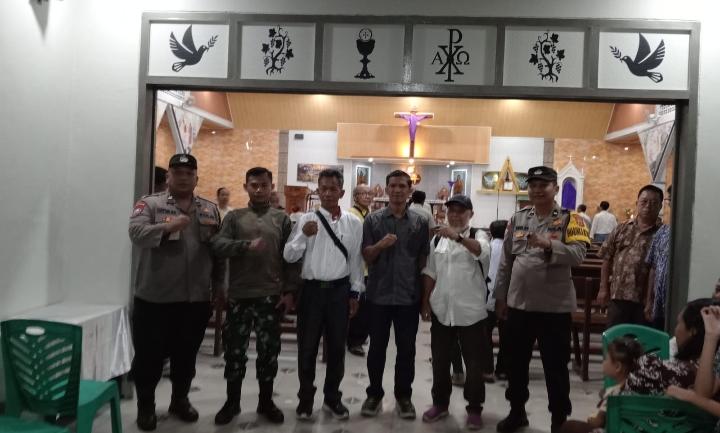 Pengamanan Misa Menjelang Paskah optimal dari anggota Polsek Punggur Lampung Tengah: Aiptu Andri Wibowo Kanitreskrim, bersama Aipda Catur Nugroho, Aipda Tedi Eko Sunaryo, Aipda Soni, Aipda Anton, dan Prada Taufik dari Koramil Punggur.