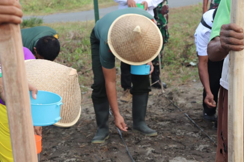 Penanaman melibatkan anggota Koramil dan jajaran Kodim 0709/Kebumen, dipantau langsung Dandim, Danramil dan Perwira Staf. Mereka bahu membahu menabur benih jagung dan menyiapkan lahannya.