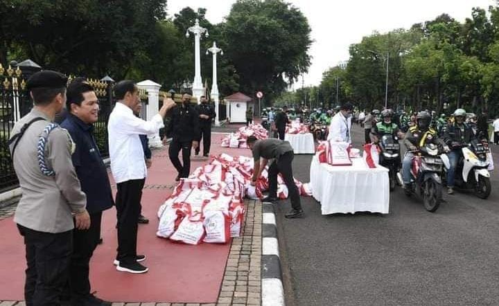 BALI, bhayangakaraperdananews.com | Jakarta – Presiden Joko Widodo menyaksikan penyerahan bantuan paket sembako bagi para pengemudi ojek daring atau ojol di sekitar Kompleks Istana Kepresidenan, Jakarta, pada Kamis, 13 April 2023. Sekitar pukul 11.50 WIB, Presiden tiba di lokasi dan langsung menyaksikan pembagian sembako di depan gerbang pintu utama Istana Merdeka.