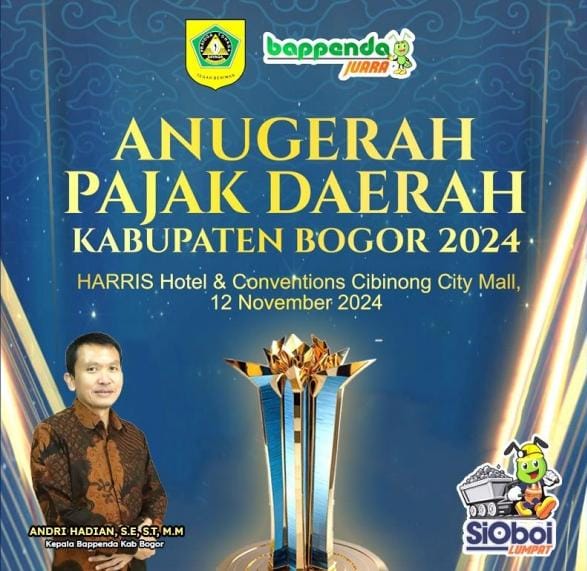 Anugerah Pajak Daerah tahun 2024 dilaksanakan pada Hari Selasa tanggal 12 November 2024 bertempat di Harris Hotel & Convention Cibinong City Mall, Jl. Tegar Beriman No. 1 Pakansari Kecamatan Cibinong. Dihadiri kurang lebih 276 Orang undangan yang terdiri dari Unsur Forkopimda Kabupaten Bogor, Instansi/Lembaga/Organisasi baik dari Provinsi Jawa Barat maupun yang berada di Wilayah Kabupaten Bogor, Perangkat Daerah, PPAT/PPATS, Camat, Kepala