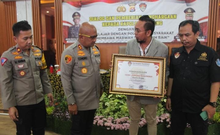 Penghargaan diberikan langsung oleh Ketum PW FRN Agus Rugiarto kepada Kapolres Serang, Polda Banten AKBP Condro Sasongko didampingi Wakapolres Kompol Ali Rahman CP di Aula Mapolres Serang pada Kamis 3 Oktober 2024.
