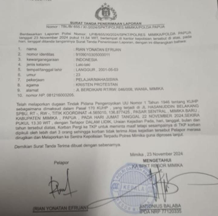 Sementara itu Dari salinan STPL yang diterima redaksi Media ini menyebutkan, Rian Yonatan Efruan telah melaporkan dugaan tindak pidana pengeroyokan UU Nomo 1 Tahun 1946 tentang KUHP, sebagaimana dimaksud dalam pasal 170 KUHP, yang terjadi di Jalan Hasanudin belakang SPBU, RT, RW, titik koordinat-4.565010,136.877425, Pasar Sentral, Mimika Baru, Kabupaten Mimika, Papua, dimana pada hari Jumat tanggal 22 November 2024 sekira pukul 13:30 Wit Korban Rian Yonatan Efruan pergi ke TKP (Kediaman Johanes Rettob) dengan tujuan untuk meminta maaf, namun sesampainya di TKP, korban dipukul oleh lebih dari tiga orang, sehingga korban tidak terima atas kejadian tersebut dan melaporkan ke sentra Kepolisian Terpadu Polres Mimika.(MBPN-Red)