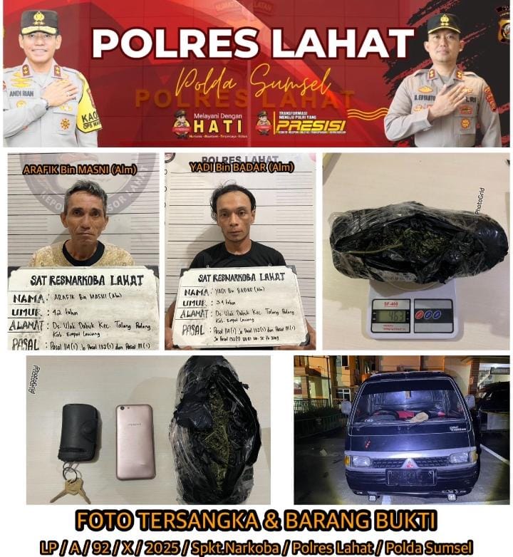 Selanjutnya Kasat Res Narkoba Polres Lahat memerintahkan Anggotanya untuk melakukan penyelidikan di lokasi tersebut. Setelah sasaran dan ciri – ciri orang tersebut telah diketahui oleh personil Satresnarkoba maka pada hari Kamis tanggal 30 Oktober 2025 sekira pukul 20.00 wib personil Satresnarkoba melakukan penangkapan terhadap tersangka a.n. ARAFIK dan YADI dan personil Satresnarkoba Polres Lahat berhasil menangkap tersangka a.n. ARAFIK dan YADI yang mana pada saat itu tersangka sedang berada didalam mobil merek Mitsubishi T120SS warna hitam dengan No.Pol: BG 8331 S yang terparkir di halaman terminal Batay yang beralamat di Kel. Pagar Agung Kec. Lahat Kab. Lahat.