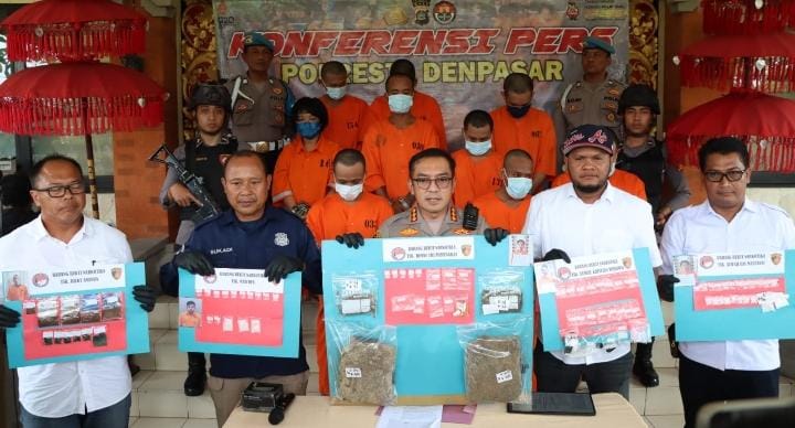 “Barang bukti yang berhasil kami amankan berupa Ganja 2.001,58 gram (2 kg),Pil Koplo 2000 butir, sabu 85.10 gram dan tembakau sintetis sebanyak 64.55 gram,” Jelas Kapolresta Denpasar.