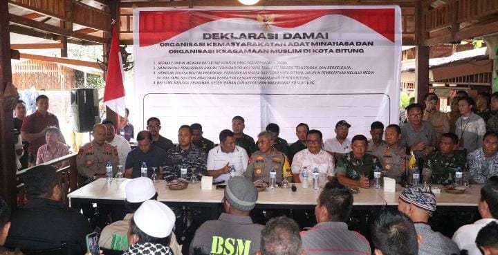 SULAWESI | bhayangkaraperdananews.com – Deklarasi damai digelorakan oleh perwakilan organisasi, kemasyarakatan Minahasa dan keagamaan muslim. Deklarasi ini juga menjadi komitmen Forkopimda yang disimbolkan dengan tandatangan deklarasi damai.
