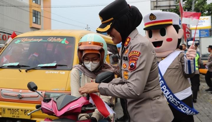 Dengan senyum, sapa dan salam, nampak AKBP Ratna beserta personel Polres Semarang membagikan bendera gratis kepada pengguna jalan, baik roda dua maupum roda empat.