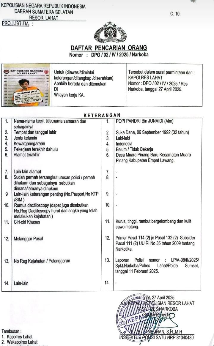 LAHAT | bhayangkaraperdananews.com – Polres Lahat melalui Satuan Narkoba telah menerbitkan Surat Daftar Pencarian Orang ( DPO ) seorang tahanan kasus Tindak Pidana Narkoba yang melarikan diri dari Rumah Tahanan (Rutan) Polres Lahat pada Minggu, 27 April 2025.