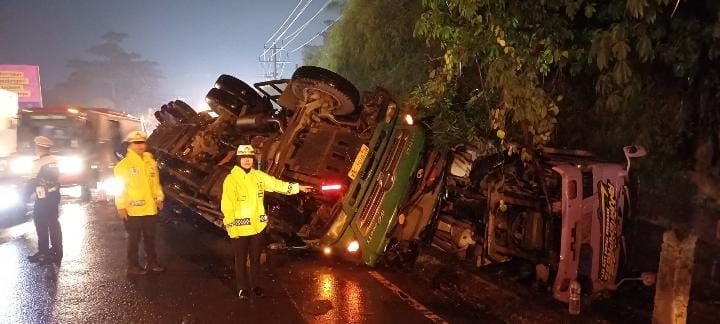 Tak kuat Nanjak, Truk Trailer muat kayu log Terguling di Tanjakan Lemah Abang