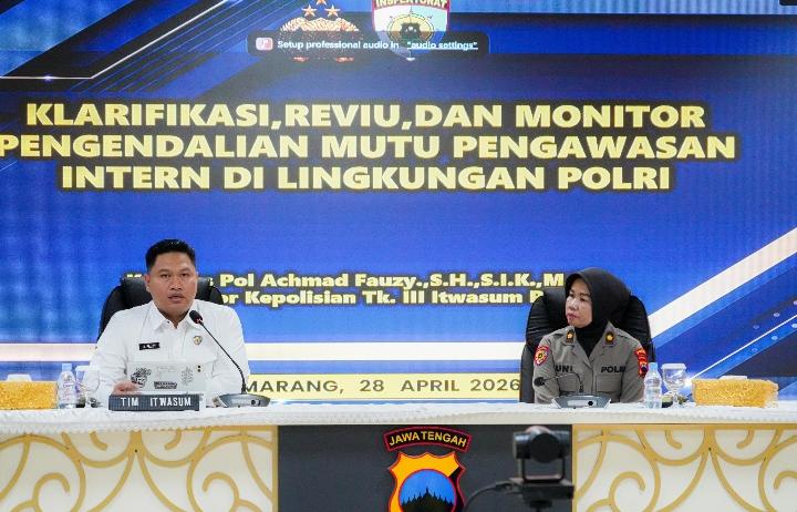 KOTA SEMARANG | bhayangkaraperdananews.com – Dalam rangka meningkatkan kualitas pengawasan dan akuntabilitas di lingkungan Polri, Polda Jateng menerima kunjungan Tim Itwasum Polri untuk melaksanakan kegiatan klarifikasi, reviu, dan monitoring pengendalian mutu pengawasan intern di lingkungan Polri Tahun Anggaran 2025. Kegiatan yang dilaksanakan pada Selasa, (28/4/2026) di Aula Mapolda Jateng ini bertujuan untuk memastikan bahwa proses audit dan pengawasan yang dilakukan di Polda Jateng berjalan sesuai dengan standar yang telah ditetapkan, serta memastikan kesesuaian antara temuan audit dan tindak lanjut yang diperlukan.